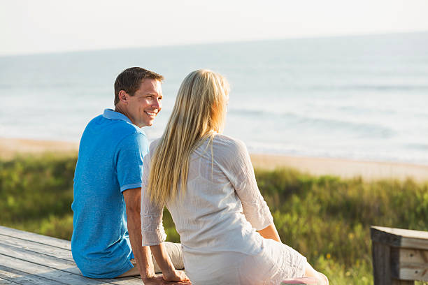 Rear view of a couple sitting together on a deck with a view of the ocean. The man is smiling and looking at the woman. It is a bright, sunny day.