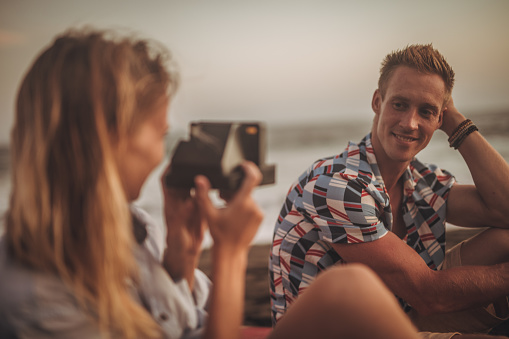 Two people, man and woman on the beach by the sea, girlfriend taking pictures of her boyfriend with instant by the sea.